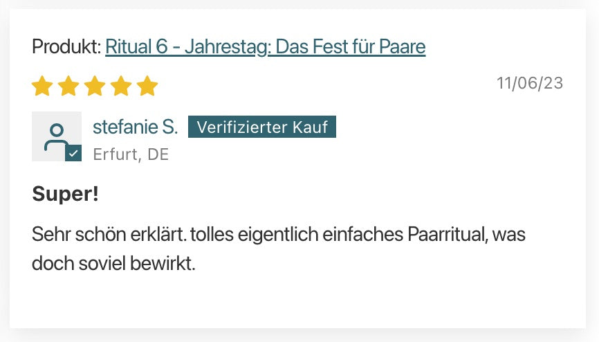 Ich habe mir die Rituale von Regina bestellt und diese ausprobiert. Inbesondere das Ritual "Im magnetischen Liebesstrom" und die Rituale zum Loslassen finde ich sehr gut gelungen. Ich kann diese nur empfehlen.