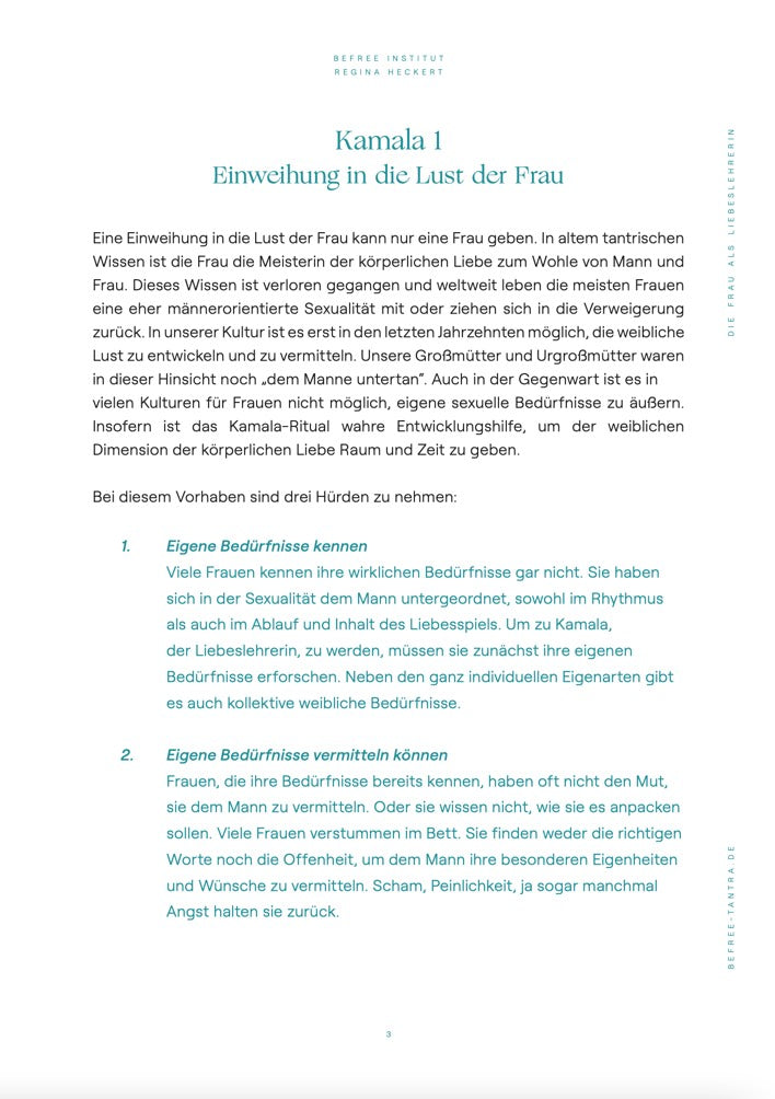 Um zu Kamala, der Liebeslehrerin, zu werden, müssen sie zunächst ihre eigenen Bedürfnisse erforschen. Neben den ganz individuellen Eigenarten gibt es auch kollektive weibliche Bedürfnisse.